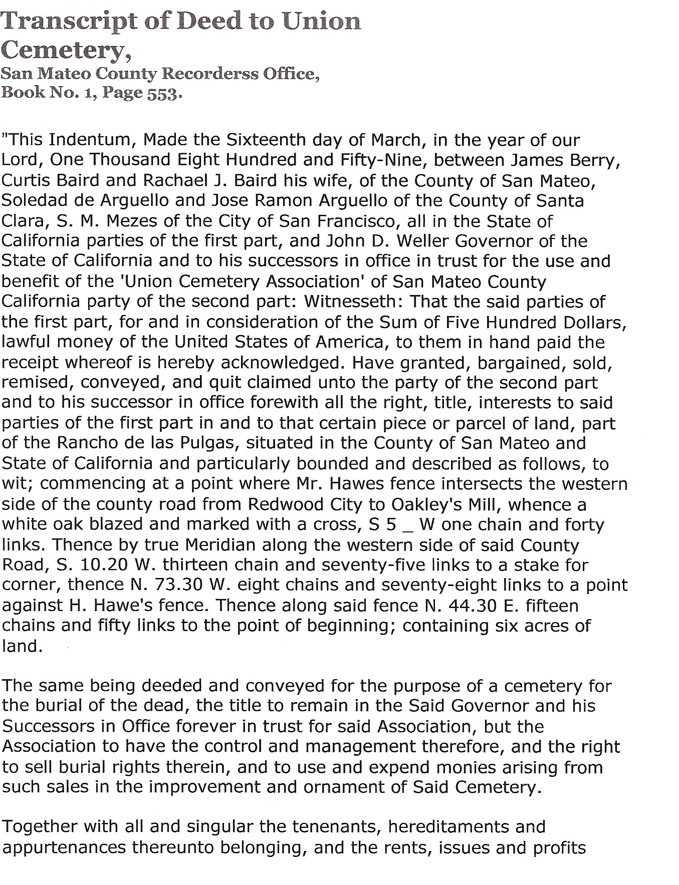 - Transcript of the Original Deed to Union Cemetery 1859, Page 1 (from John Edmonds 12/14/11)